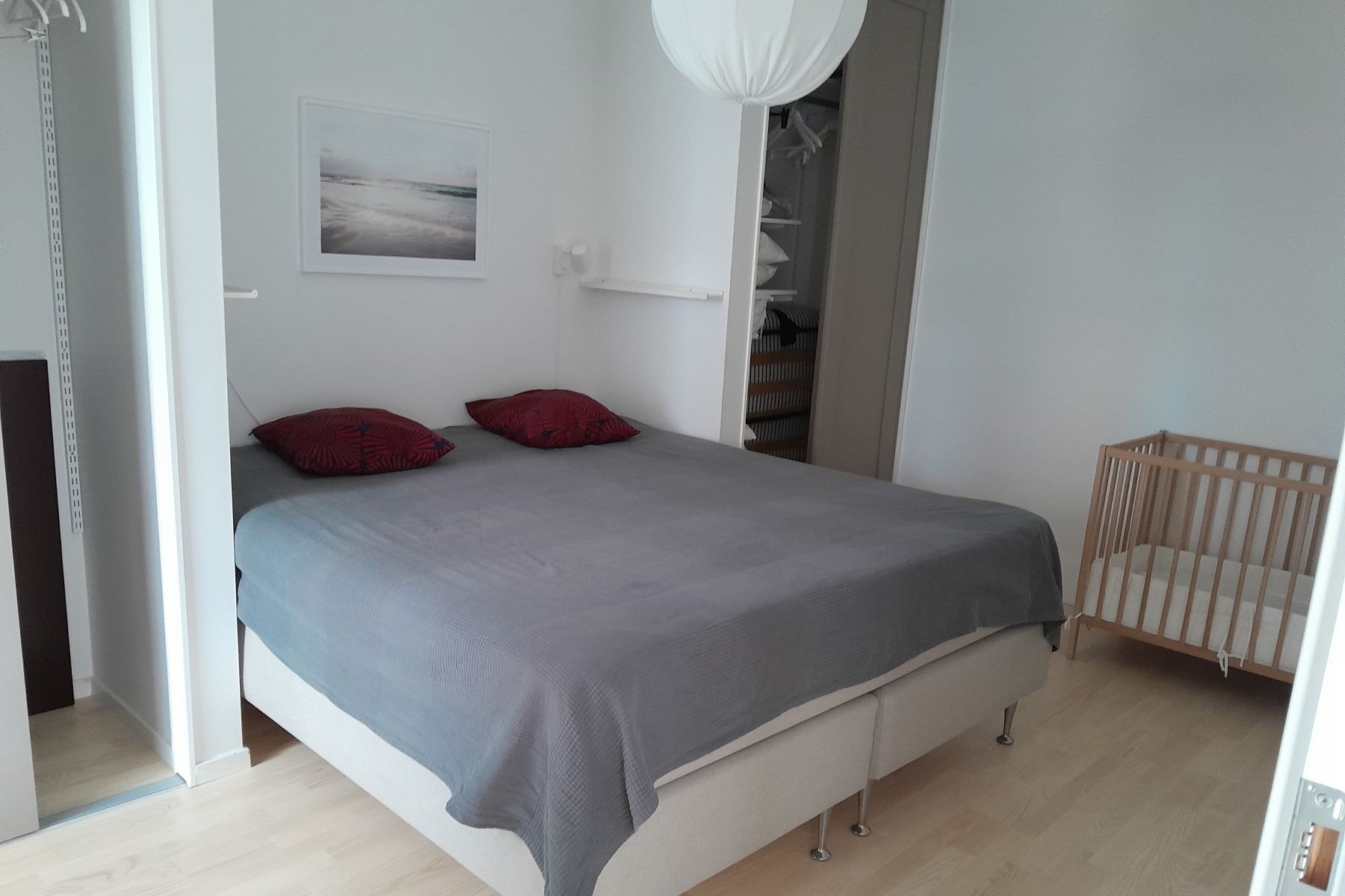 Lägenheten är lagom stor till en barnfamilj. Den har 6-7 bäddar fördelade på en dubbelsäng i masters bedroom, en spjälsäng, en bäddsoffa i allrummet och en dagbädd för två samt en ihopfällbar extrasäng i ett mindre sovrum.